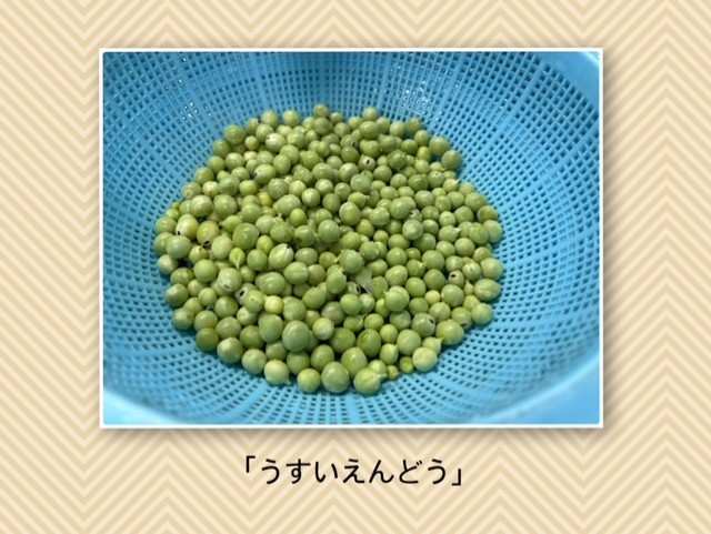 給食の時間、自分たちでむいた豆がごはんに入っているのをみて、「朝むいたやつだ!」と喜んで食べてくれました。