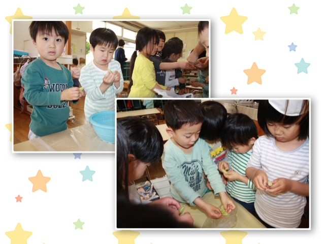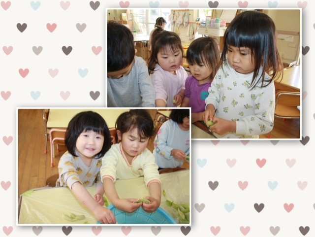 先日、今年度初めての食育活動として「豆ごはん」に使用する「うすいえんどう」の皮むきを幼児チームにお手伝いしてもらいました。