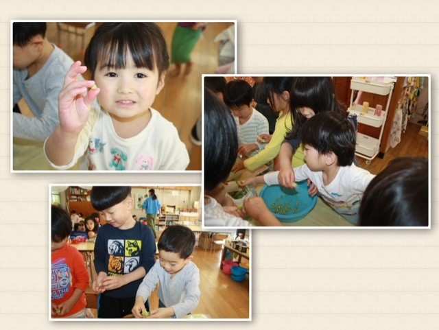 「皮は大きいのに中のお豆はこんなにちっさかったよ!」と発見をする子がいたり、「5個もお豆が入ってた!」と友達と入っている個数を数えあう子もいました。