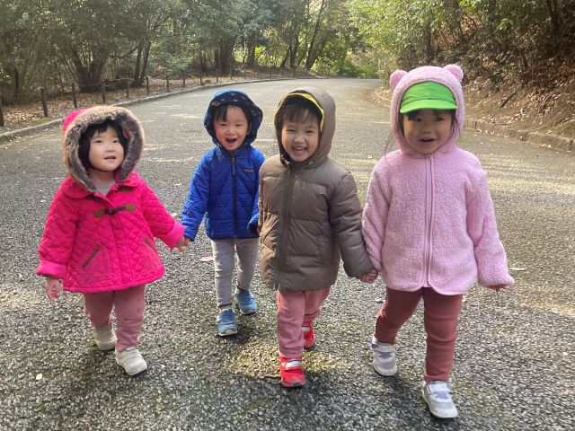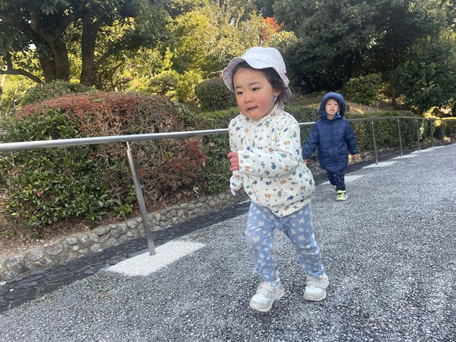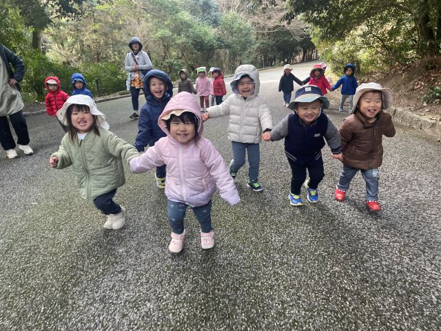 急な登り坂を駆け上がったり砂利道をかけっこしました。ポカポカ温まりました。