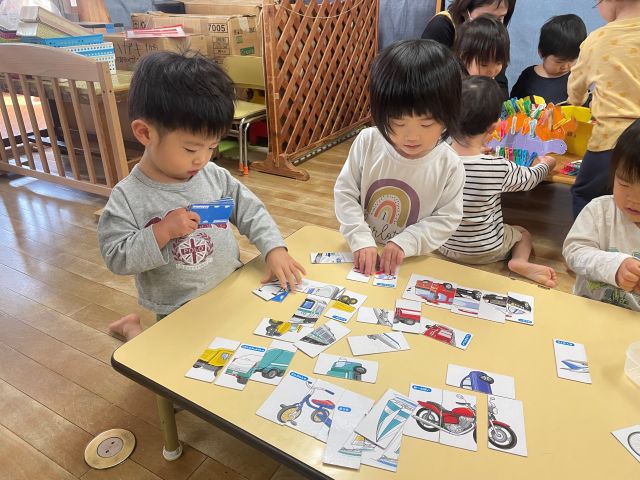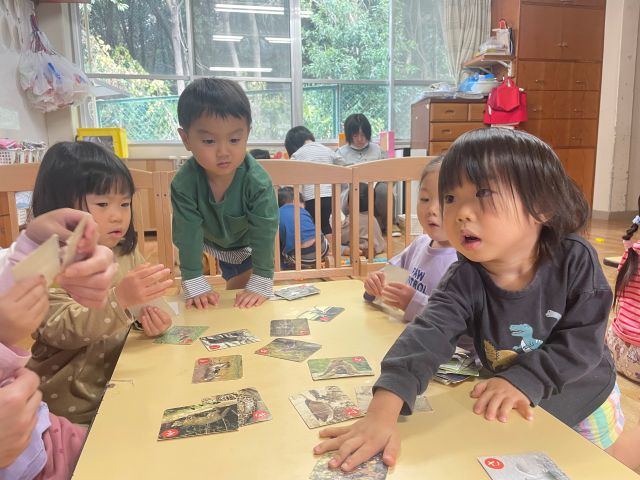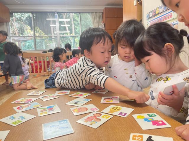 あいうえおカルタとどうぶつカルタ。ルールを守っての真剣勝負。読まれたカードを見つけると‘はい!’と勢い良く手が伸びて、なかなか白熱してました。