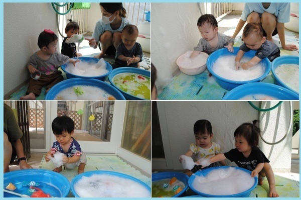 泡あそびは最初は眉をへの字にして触っていた子もいましたが、一緒に遊ぶうちに顔つきが変わり手をゴシゴシこすり合わせて洗うマネっ子や、ザブン!と途中からは肘までダイブするほどに!