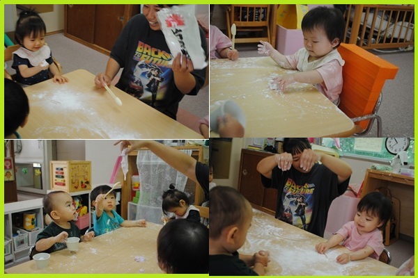 片栗粉は小麦粉粘土を以前していたからか初めからみんな遊ぶ気マンマンで、片栗粉を出すと同時に手を伸ばすほどでした!
