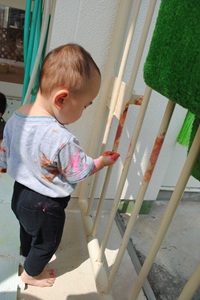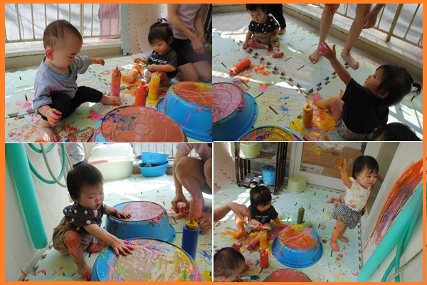 夏の遊びが終わる頃にはタライにぬりぬり!、柵にぬりぬり!壁に手形を付けてみたりとみんな思い想いにえのぐであそんでいました。