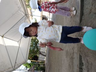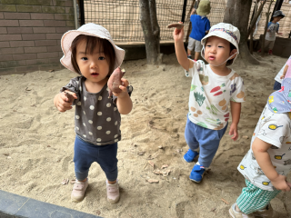 〈お芋堀りごっこ〉幼児クラスの子ども達が、お芋堀りに行って掘ってきた小さいお芋をもらってお庭でお芋堀りごっこを楽しみました。お芋?どこどこ?とスコップや手でほりほりしている姿がとってもかわいいぶどうちゃん達です。砂の中に全部埋めちゃうと難しいので、お芋の頭をちょっと出しておいたり、ふっくらお山にしたりしておきます。お芋堀り、、、というよりお芋探しですね。