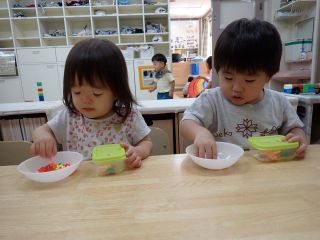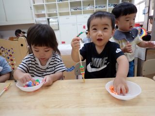 花はじきをひもやお箸に、、真剣に通したり穴の開いた箱にポットン。