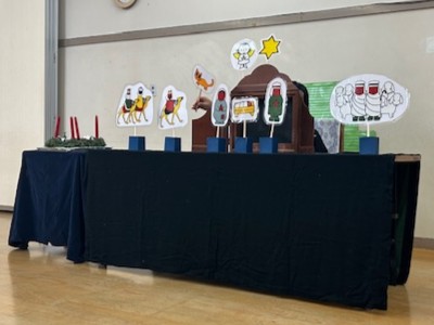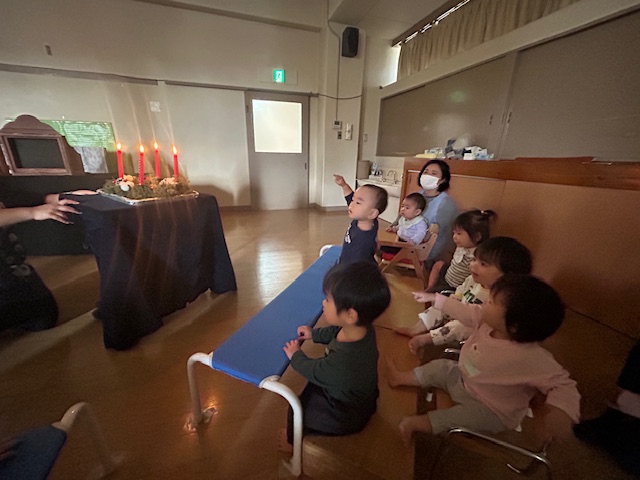 そして、もうすぐでクリスマスですね、アドベント礼拝でロウソクに火が灯る場面が大好きな子どもたち。嬉しそうにロウソクの火を見つめる眼差しがかわいらしかったですよ。礼拝では、ヨセフさん(パパ)、マリアさん(ママ)、イエス様(赤ちゃん)、天使、博士、色々な動物が出てきてみんなでイエス様の誕生をお祝いしに行くお話を聞きました。4回目のアドベント礼拝では乳児クラスのみんなで集まってクリスマスツリーの飾りつけを楽しみましたよ。