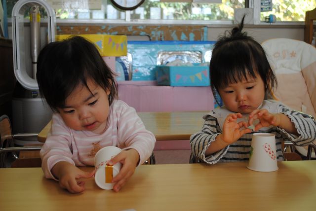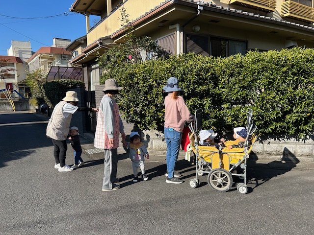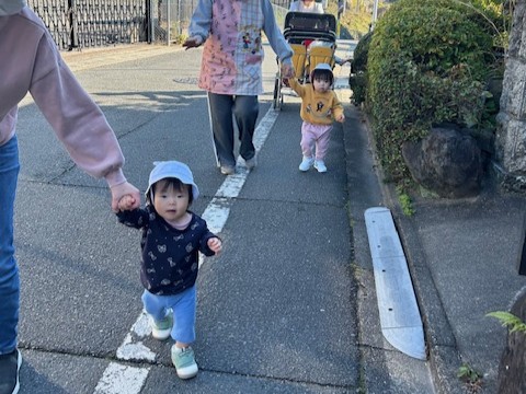 11月入るとだいぶ涼しく過ごしやすくなり、すみれさん達は戸外遊びをたくさん楽しむことができました。「ぱっぱ!(はっぱ)」と教えてくれたので綺麗に色づく葉っぱを渡すと、大事に握りしめる子や、お友だちと一緒にちぎって遊ぶ子、ポイ!と投げる子など、葉っぱだけでたくさんの楽しみ方を見せてくれる子どもたちでした。また、月齢の大きい子は靴を履いて手つなぎ歩きの練習も開始しました。坂道もしっかり自分の足で、自分のペースで登れたり、JRまでの片道を歩けるようになったり、体力もしっかりついてきましたね。月齢の小さい子、まだ歩行が安定していない子は、お部屋の運動あそび中に登って、降りて、くぐって、などの動作でたくさん身体を動かせて思いっきり遊びましたよ。