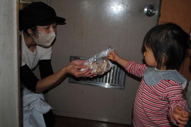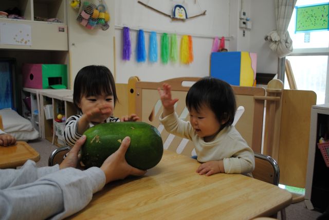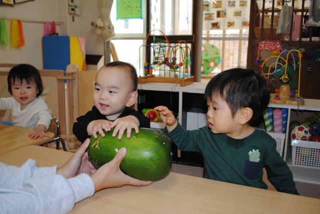 礼拝では、お野菜の紹介をしながら触り心地、叩いて音、実際に触わる体験もしてみました。大きいお野菜だとやや緊張ぎみの子もいましたが、お友だちが触っているのを見て安心して触れるようになったり、転がしてみたりと興味を持っている様子でした。そのあとに野菜が大きくなる過程のお話をしましたが、子どもたちは、出来上がったお芋のバター焼きで頭がいっぱい!((笑))お話はさっと終わり、おやつタイムを堪能し、満足そうに食べていました。実りに感謝、食べられることに感謝をしながら、これからもたくさん食べて大きくなってね!