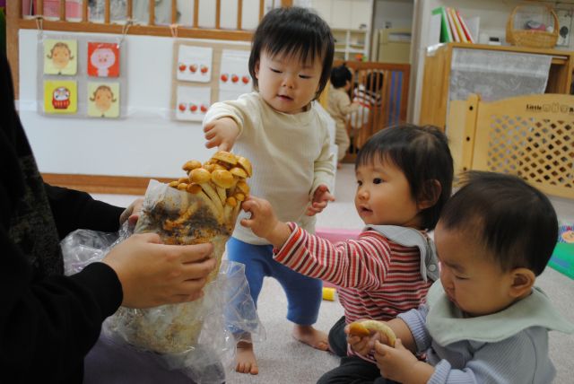 お部屋では、なめことレタスを栽培しています。あっという間に大きくなって立派なものを収穫することができました。キノコを収穫するのが楽しかったようで、何度もプチプチ!とちぎり取り、たくさん収穫出来て嬉しそうにする子どもたち。給食室に持って行き、給食の先生にお料理してもらうようお願いしました。翌日登園した子どもたち、お隣のぶどうチームにもおすそ分けして大事にいただきました。残念ながらお休みで食べられない子もいましたが、またどんどん生えてくるのでご安心を。収穫できたらまたみんなで頂きたいと思っています。