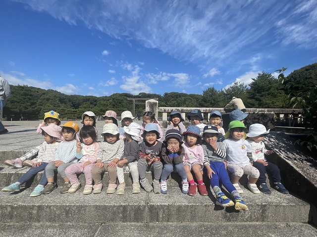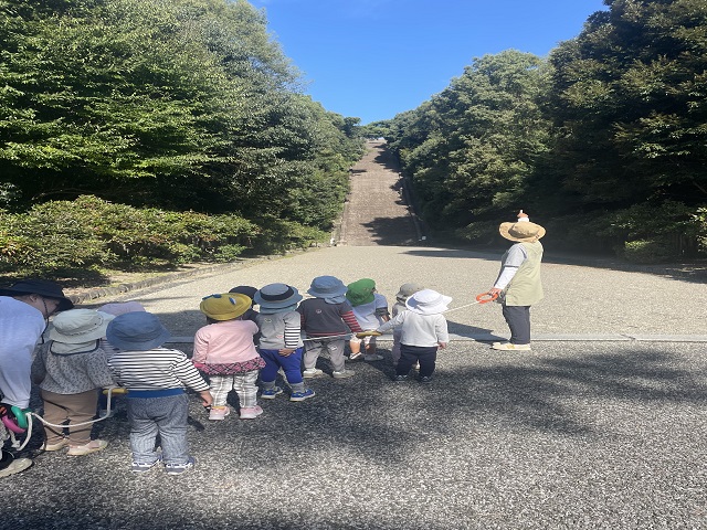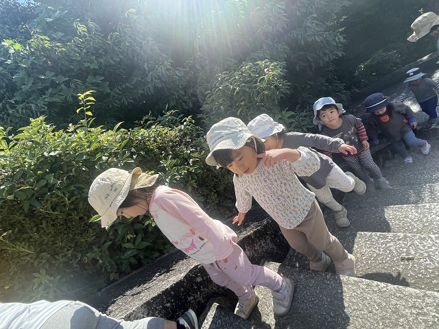 天気の良い日にお散歩へ行きました。今回は初めての石段に挑戦。その段数は何と230段!「おおきーい」や「おそらにとどきそう」と興味津々のゆりさんでした。一段一段ゆっくり登る子もいれば、早く登る子も。みんな頑張って最後まで登りきっていました。
