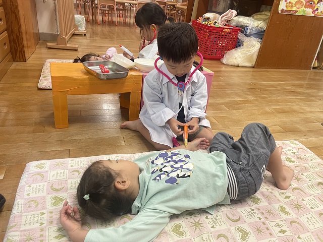 白衣を着て聴診器をつけて、患者さんのお友達に注射をしてあげていました。