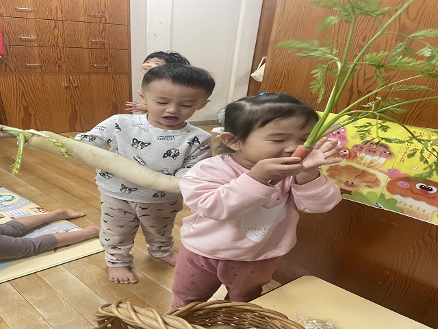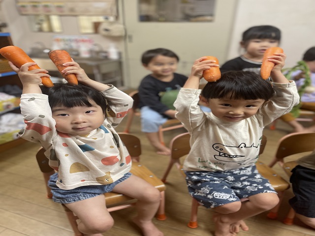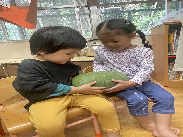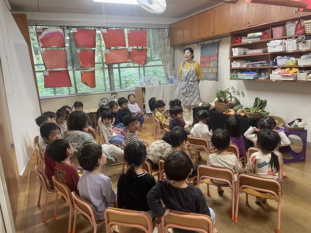 お家から野菜を持ち寄って、実際に触れたり匂ったり、自分が持ってきた野菜を覚えている子もいました。