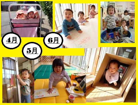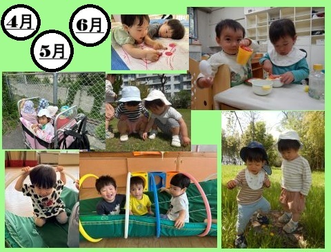 お部屋や保育者に少しずつ慣れ、ニコニコ笑顔が増えてきた4月・5月・6月。