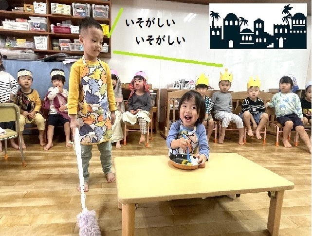幼児さんが演じていたそれぞれの役や場面のひとつひとつが、ゆりさんにはインパクトがあったようで、本当に特に教えてもいないのに上手に演じるゆりさんでした。ゆりチームで過ごすのもあと2か月ほど。1日1日を大切に過ごしていきたいです。(T)