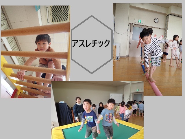 身体もうごかさないとね!で、ホールでアスレチックもしました。普段は、出てこないトランポリンも登場で汗をかいて楽しんでました。