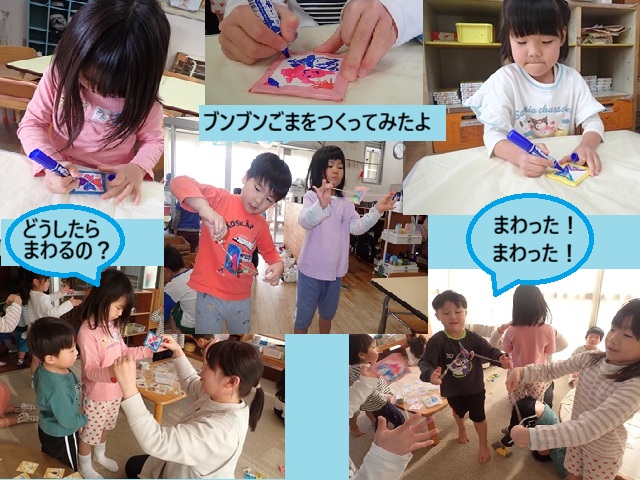 新しい年が明け1月が始まりました。毎朝身震いするほど寒い日が続いていますが、毎日元気な子どもたちです。ブンブンゴマを作ってみました。